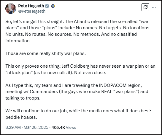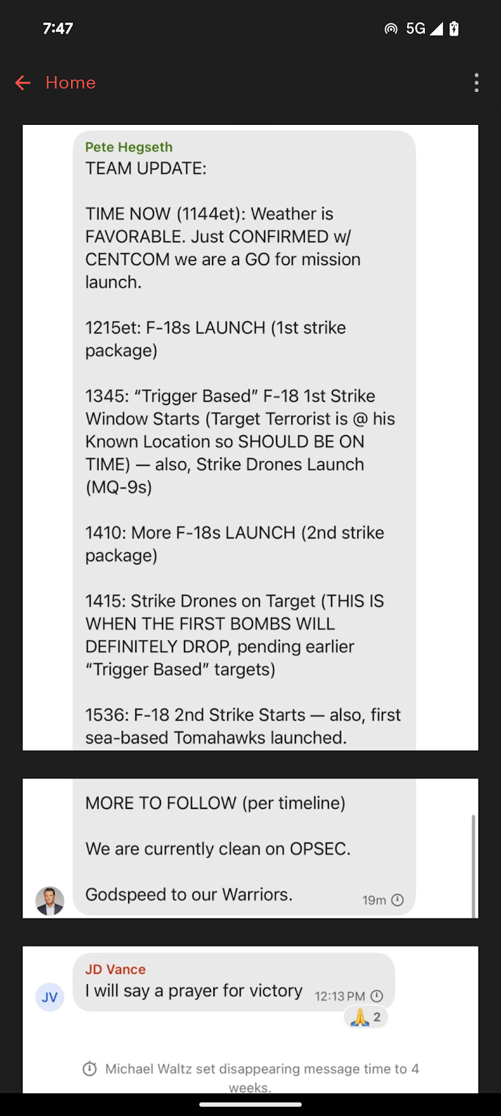 - Un-fucking-believable: Mike Waltz just posted… “No locations. No sources & methods. NO WAR PLANS. Foreign partners had already been notified that strikes were imminent. BOTTOM LINE: President Trump is protecting America and our interests.” And then Pete Hegseth reposted that bullshit.