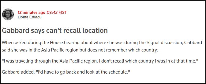 Democrats AND Republicans are so damn guilty of this dude… We're not discussing the events of years past; everything being discussed has happened in the last 16 days, and the cop-out of “I can’t recall” just falls so flat here. The attack took place on March 15th; if Tulsi Gabbard, the United States Director of Intelligence, can’t recall what country she was in ELEVEN DAYS AGO, perhaps she lacks the basic requirements of a job at this caliber.