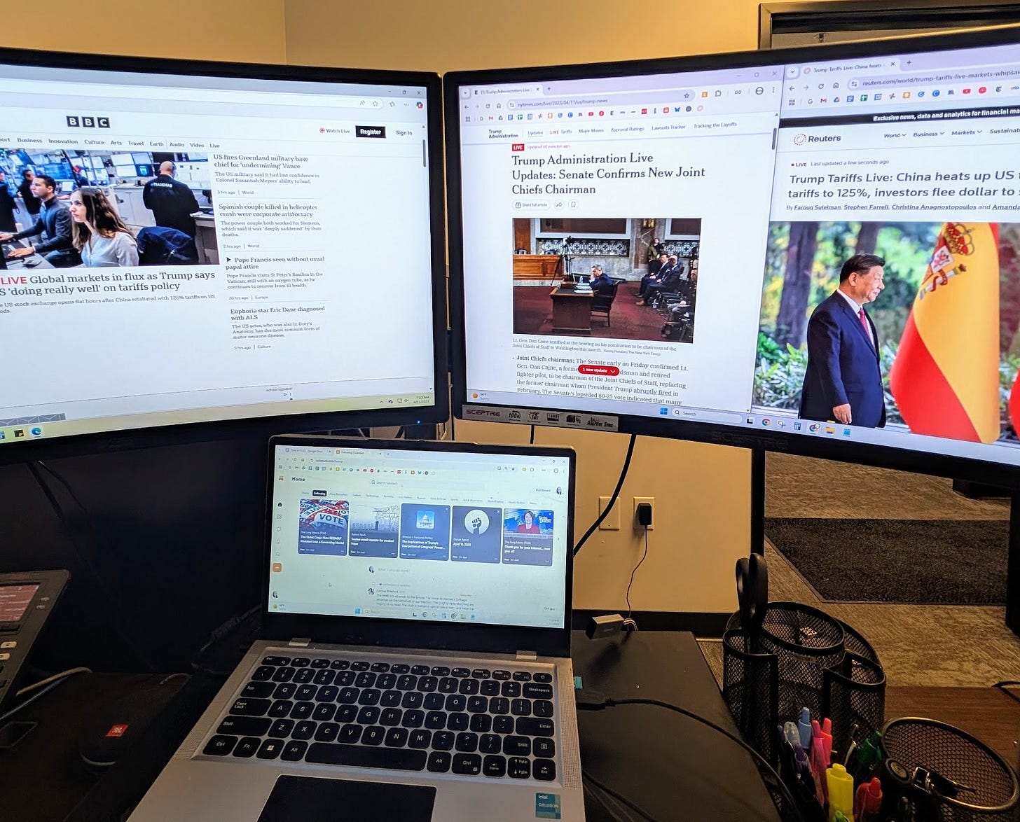 I'm not messing around today: one screen is split between Reuters and New York Times live updates, one screen is on the BBC, and I'm scrolling Substack as well.