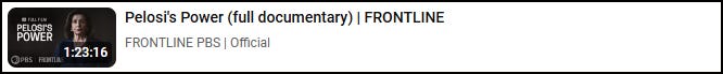 It’s valuable to watch Pelosi’s Power for the same reason as Mitch McConnell; this is a person who’s been in power for a very long time, and had lasting influence on the course of our history. I certainly understand her better, but I see her in a harsher light now.