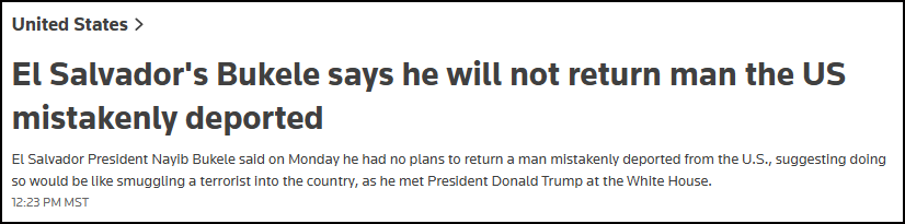 I want to quote Zolan Kanno-Youngs of New York Times, regarding the meeting in the Oval Office today between President Nayib Bukele of El Salvador and President Trump: “The message from the meeting was clear: Neither Mr. Trump nor Mr. Bukele had any intention of returning Mr. Abrego Garcia, even though the Supreme Court has ruled that he should come back to the United States. The case has come to symbolize Mr. Trump’s defiance of the courts and his willingness to deport people without due process.”
